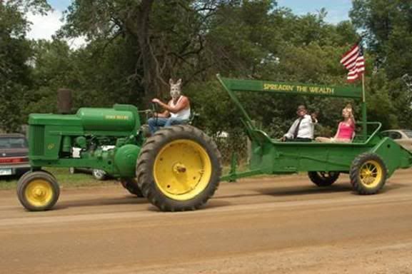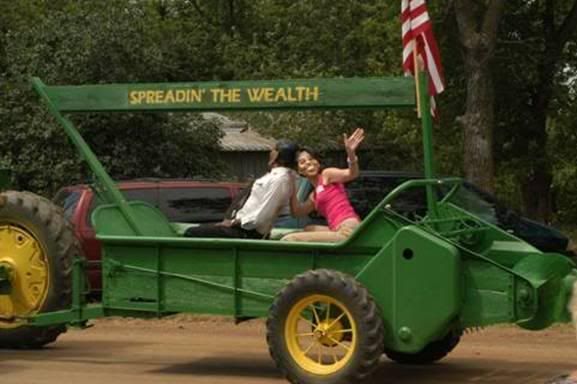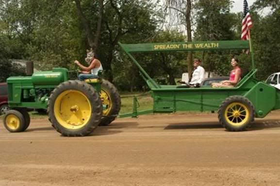 For any of you city folk, the implement in which "Barack and Michelle" are riding is called a manure spreader.
