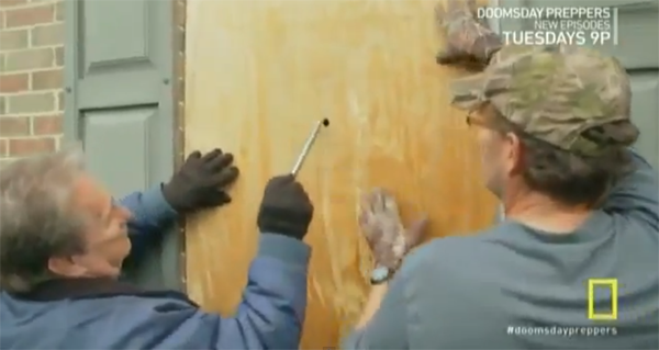 http://teotwawkiblog.blogspot.com/2013/01/something-useful-from-doomsday-preppers.htmlQuick description: the window is opened, and a long bolt fed in through a hole in the pre-cut plywood and then through a 2x4 cross brace on the interior of the home. Tightened the bolt down and you're good to go. They're using 3/4 inch plywood and, in Doomsday Preppers style, spend some time trying to smash through it. Not bullet proof, but it will certainly slow someone from getting into a home and provide concealment, too.