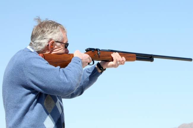 Sen. Harry Reid shoots his personal 12-gauge shotgun during the grand opening of the Clark County Shooting Park in Las Vegas Saturday, March 27, 2010.