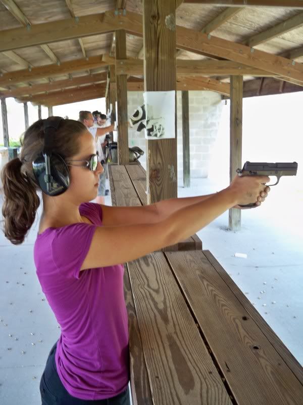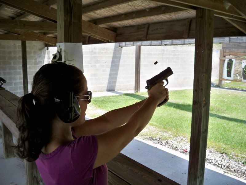 The double action trigger is better than I expected it to be & doesn't seem like I have to pull it a mile like my S & W 442. The single action trigger is very crisp & I didn't feel any creep but then again I'm no expert & never claim to be. We were shooting at 15 yards & everything went where I aimed it. I'm not the greatest marksman but after the first couple magazines through it I could tell that it was capable of having great out of the box accuracy in the right hands. The ejected brass all landed in a nice pile next to my feet & for some reason down the front my lady's shirt when she was shooting it. I brought both supplied back straps with me & started off with the arched & switched to flat after a hundred rounds or so. The difference was so slight in my opinion that  I probably couldn't tell the difference if blind folded. The three supplied magazines all functioned flawlessly after the first mishap that I already mentioned. When I got home I cleaned it with Strike Hold & lightly oiled it with MILITEC-1 & wanted to go get it dirty again! I love it & would suggest one to anyone in the market for a 9mm. If I was forced to change something I would have the magazine release stick out just a hair more. I took Timothy's advice, wraped the pistol in a plastic bag, stuck it in the Galco holster over night & it worked great without having to take a chance with soaking it in water or alcohol.  I'll include some pics of my special lady friend shooting it & getting to know her ejected brass.