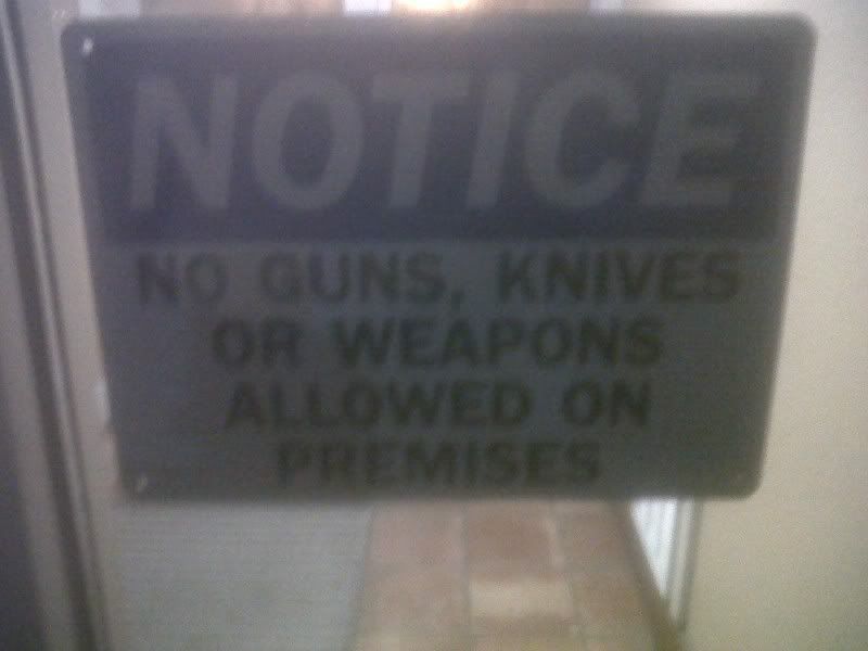 I asked when I checked in "What's up with the no guns and stuff signs?"  Their reply was "We're afraid of violence and shootings."  I quietly finished the check in and went about my evening.  Wouldn't be bad coming and going to move in and for a supper meeting, but every door has these big blue and white signs held to the glass with silicone (I checked to see how tight they are).