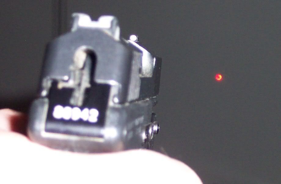 I've got the little red dot aligned so that the top half rests atop the gun's front sight at a distance of approximately 25 feet. Fine tuning will be performed on my next visit to the range.....................probably tomorrow, since it's supposed to get close to 50 degrees here tomorrow.