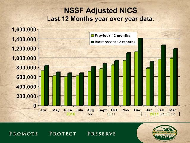 This is getting to be something of a broken record - not that I'm complaining. March 2012 marks the 22nd straight month in which the NSSF-adjusted NICS checks (National Instant Criminal Background Check System) has increased when compared to the same period last year.