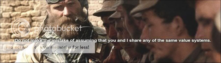 That's true Kid. I think I've made it clear that I understand that fact. BUT just because we're fighting thugs doesn't mean we get to become one either. No one ever became a saint by living among sinners. I want our troopsto be  able to do what they need to do, but we also need to remember why we are different from the other guys and part of that is understanding that there certain things that we simply WILL not (not cannot, but Will not) do. Why? Because its its wrong, for us, for them, today, yesterday and tomorrow and we just won't go there. Again, I say for the second time  on this thread, it's a matter of honor. At the end of the day, that's the only thing you get to take with you in the casket. You've got it or you don't.